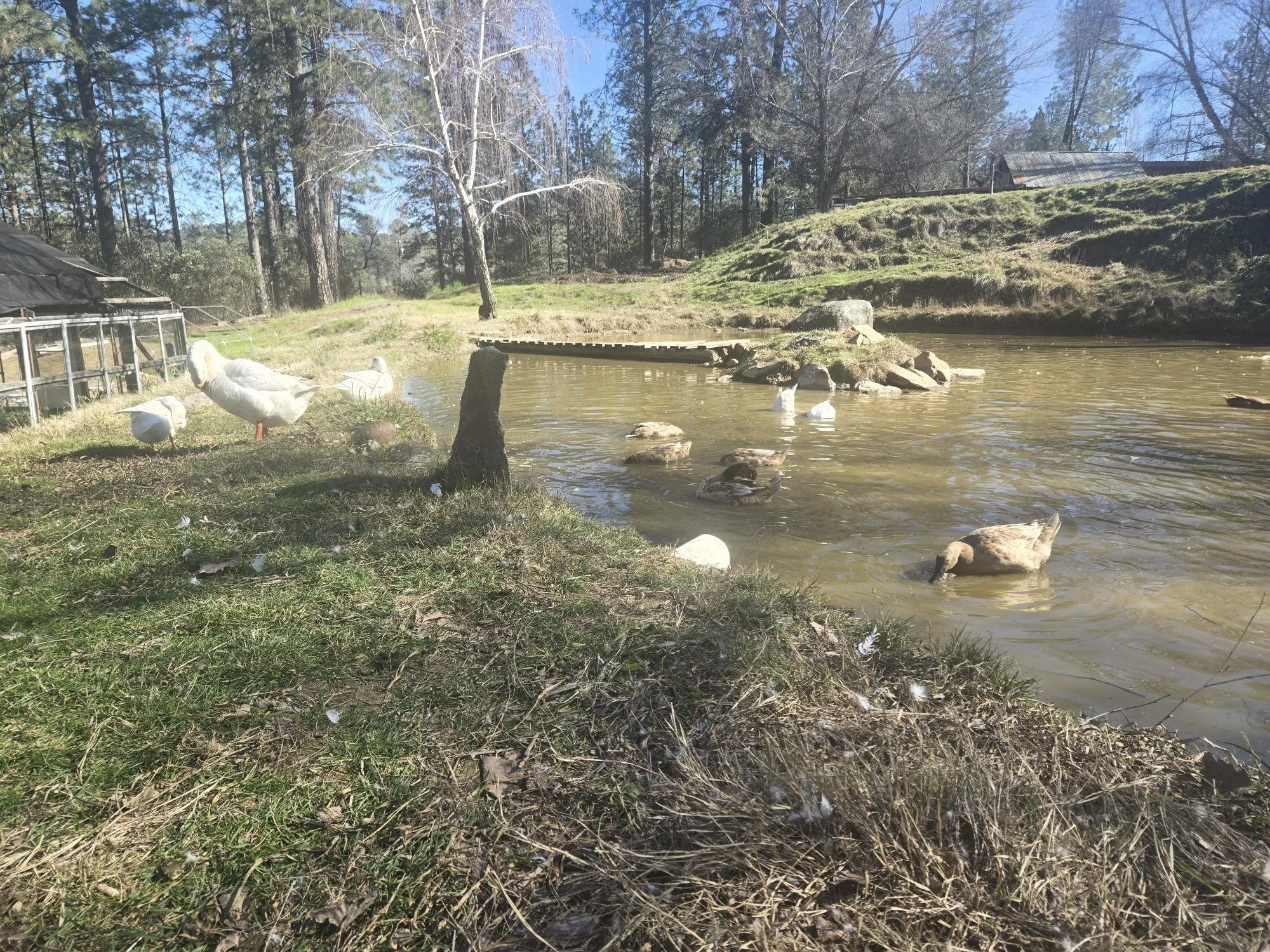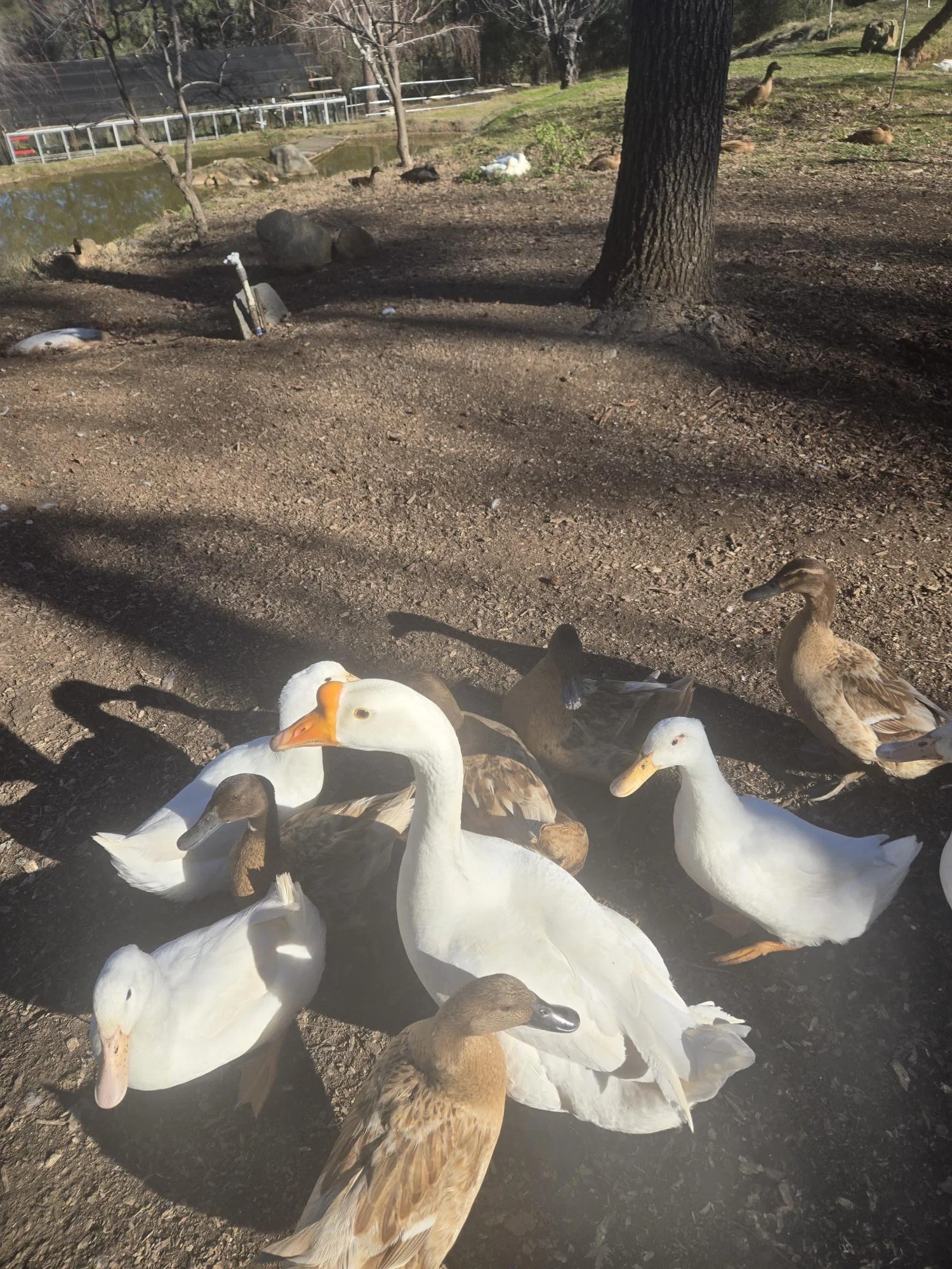 Gertrude is the guardian of Tenelach Tuathanas. With her striking blue eyes and elegant white feathers, she watches over the ponds and pathways with calm authority. She keeps close to her flock, guiding the ducks, clearing weeds around the water, and maintaining order with quiet confidence.
